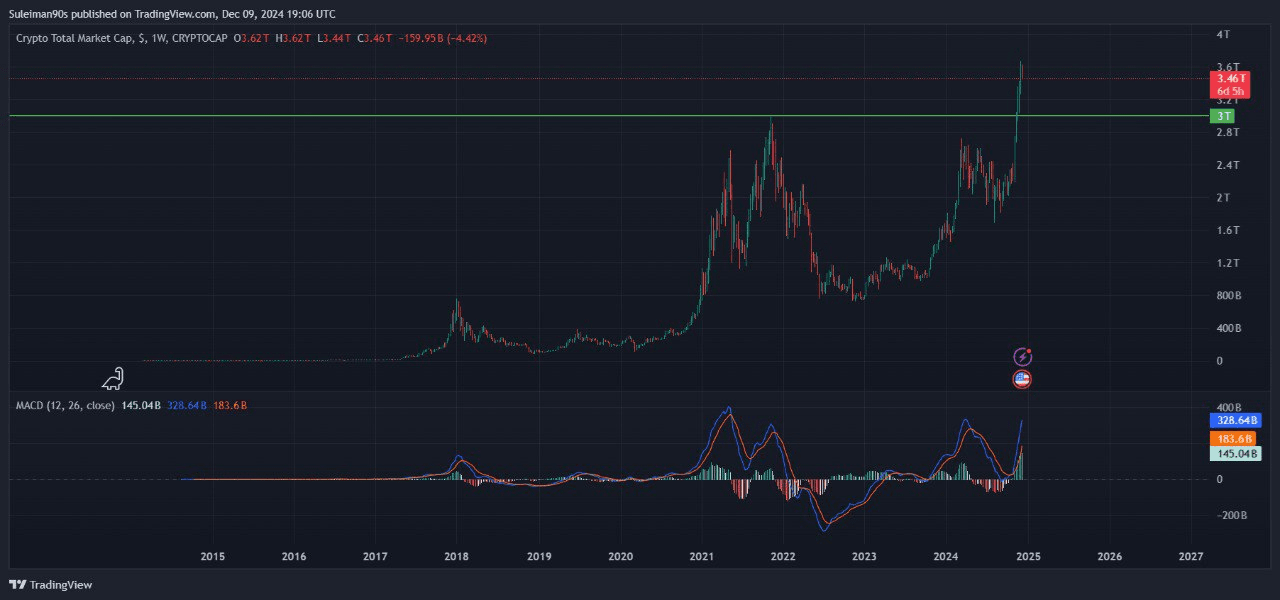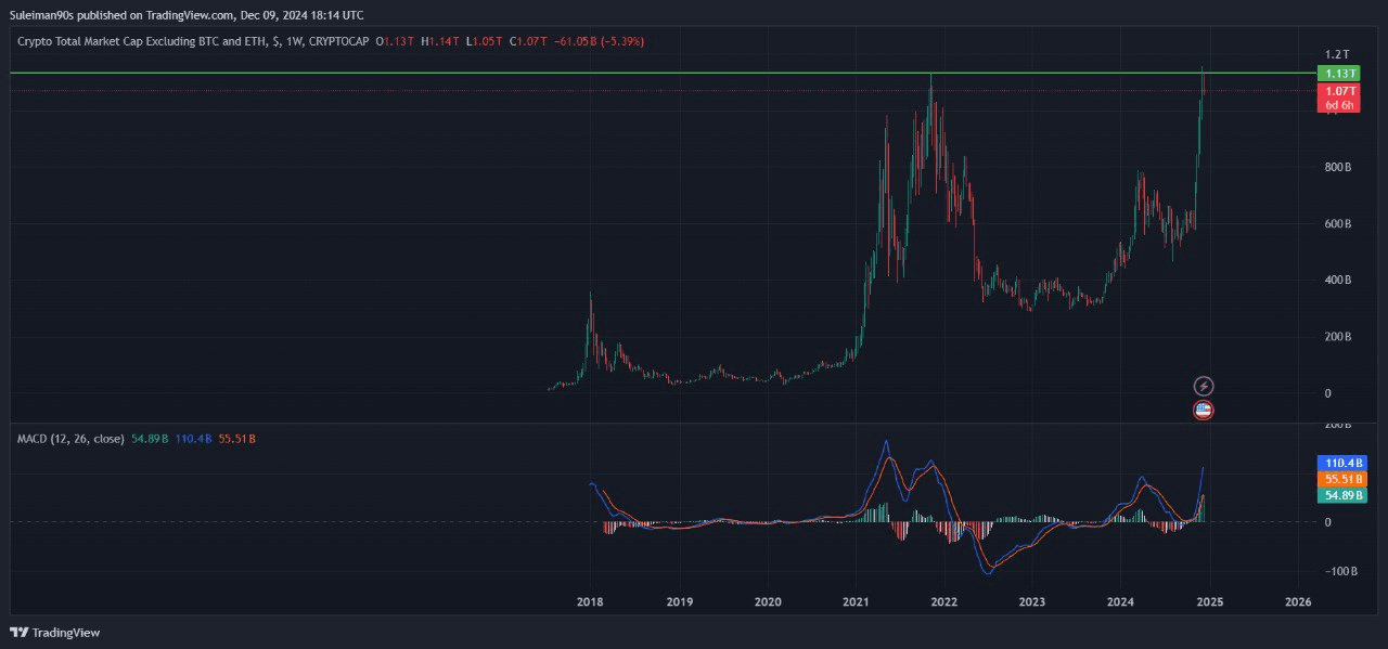 In questa lettura guardiamo anche ai livelli raggiunti dalla liquidità delle valute digitali alternative (con Ethereum), che si chiama TOTAL3. (immagine sotto)