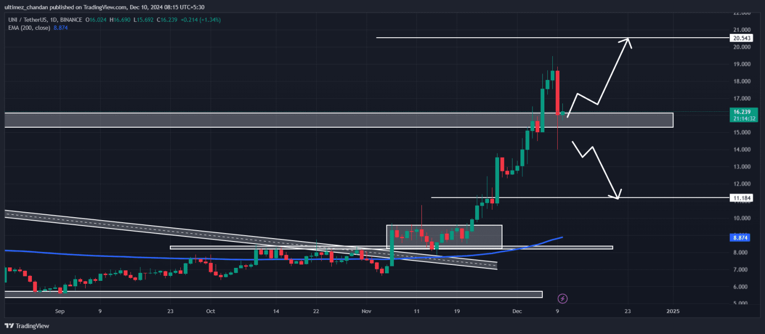 Scenario Bullish: Se UNI si mantiene sopra $14,90, ha il potenziale di aumentare del 20% nei prossimi giorni e raggiungere $19,75.