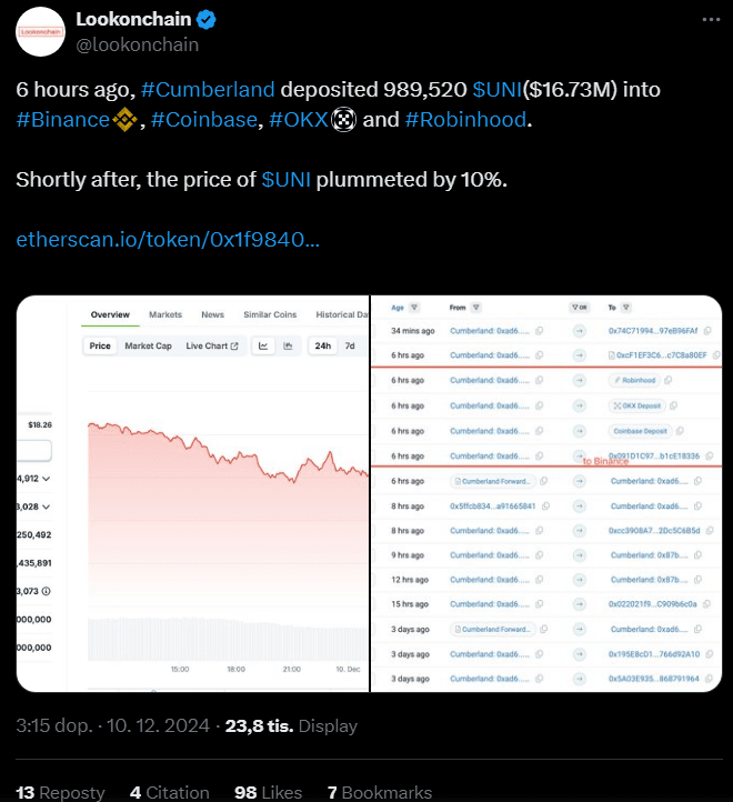 Il token nativo della piattaforma UniSwap, UNI, è sotto significativa pressione e sta affrontando un potenziale ulteriore calo del prezzo. Il 10 dicembre 2024, il tracker delle transazioni delle balene Lookonchain ha riportato su X (precedentemente Twitter) che la società di trading Cumberland aveva venduto un sostanziale 989.520 token UNI del valore di 16,73 milioni di dollari.