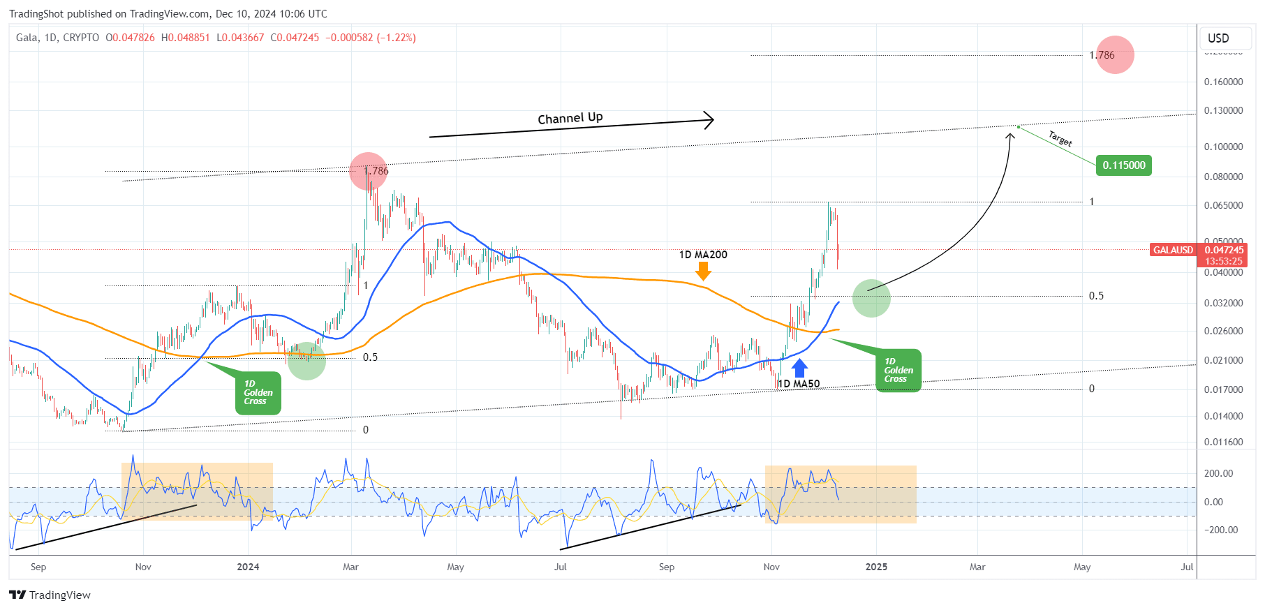 Anche se l'altezza del 10 marzo 2024 è stata quotata sull'estensione di Fibonacci 1.786, il nostro prossimo obiettivo dovrebbe essere all'interno del Canale Up di 1 anno (fino a quando non verrà rotto), quindi punteremo a 0.11500.