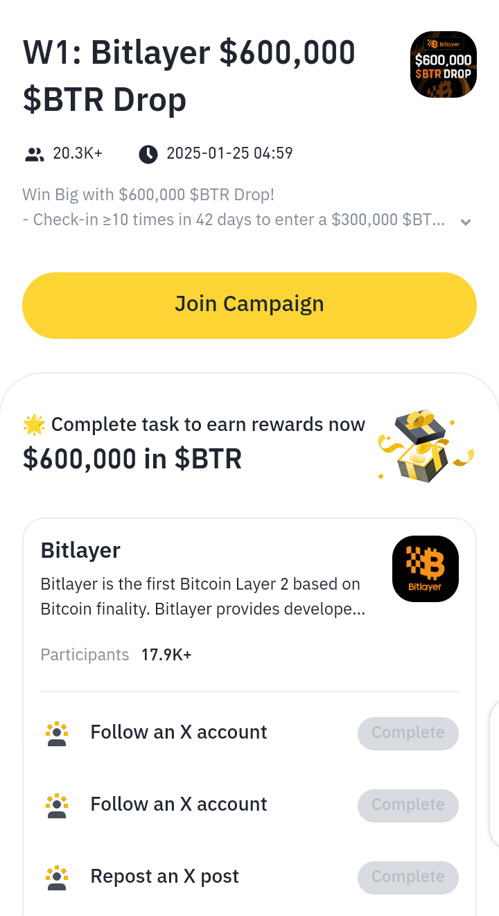 Non perdere questa occasione per vincere alla grande con Bitlayer! Unisciti alla campagna e inizia a completare i compiti per guadagnare ricompense ora! 🚀