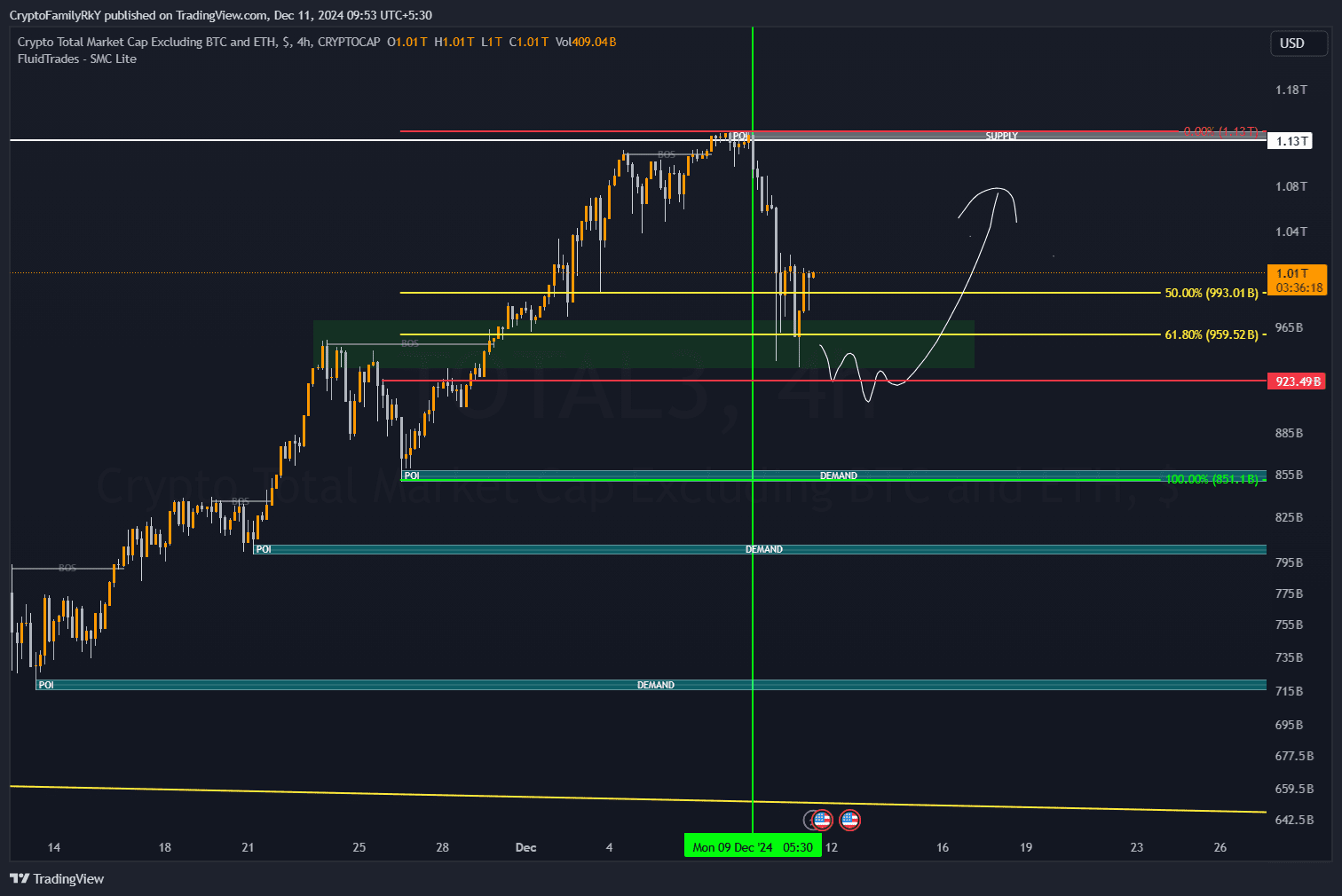 Allo stesso modo, TOTAL3 è come il budget dell'azienda. Quando scende a un livello critico (950-930 miliardi di dollari), prepara il terreno per una ricostruzione.