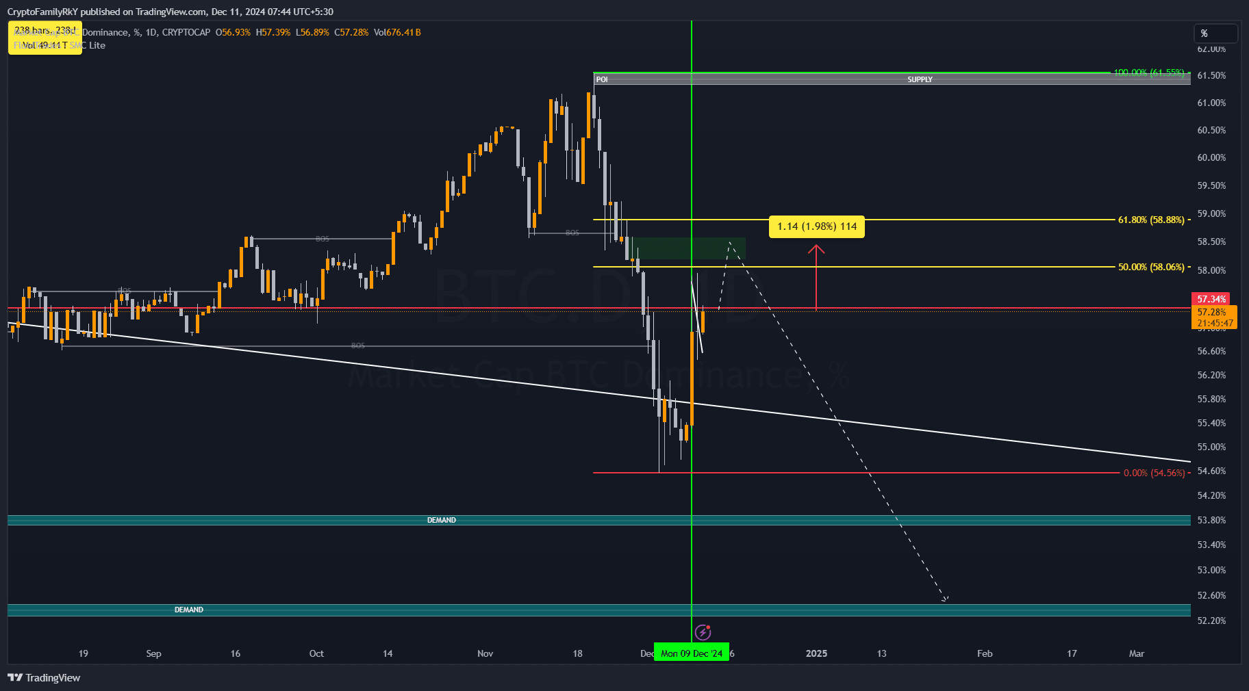 Per capire perché le altcoin sono in flessione, iniziamo a guardare la Dominanza BTC (BTC.D). BTC.D indica quanto del mercato delle criptovalute è occupato da Bitcoin rispetto alle altcoin.