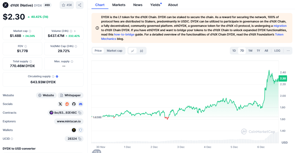 1. dYdX – Una piattaforma di trading decentralizzata per contratti perpetui, trading con margine e trading spot. Gli investimenti di Craft Ventures hanno contribuito all'aumento del valore del token del progetto di oltre il 24% in un solo giorno.