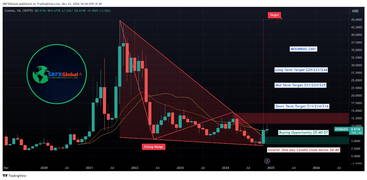 In un recente sviluppo, Cosmos (ATOM) ha catturato l'attenzione degli investitori e degli analisti cripto. Dopo aver rotto un modello di wedge discendente di un mese, ATOM ha mostrato un robusto segnale rialzista stabilendo la candela di questo mese sopra la critica media mobile a 20 periodi. Questo sviluppo tecnico suggerisce una tendenza positiva per ATOM, segnalando che ora potrebbe essere un momento ideale per gli investitori per prestare attenzione.