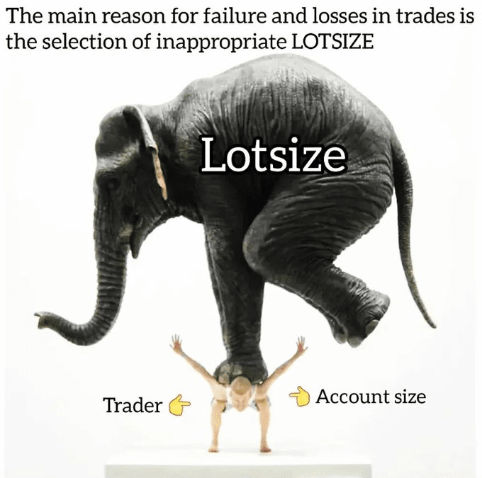 Nell'immagine, il trader sta bilanciando su un fragile filo mentre porta un sacco sovradimensionato etichettato "Dimensione del Lotto". Ecco la pillola amara: fare trading con dimensioni di lotto oltre la capacità del tuo portafoglio è come cercare di sollevare un elefante. Non finisce bene.