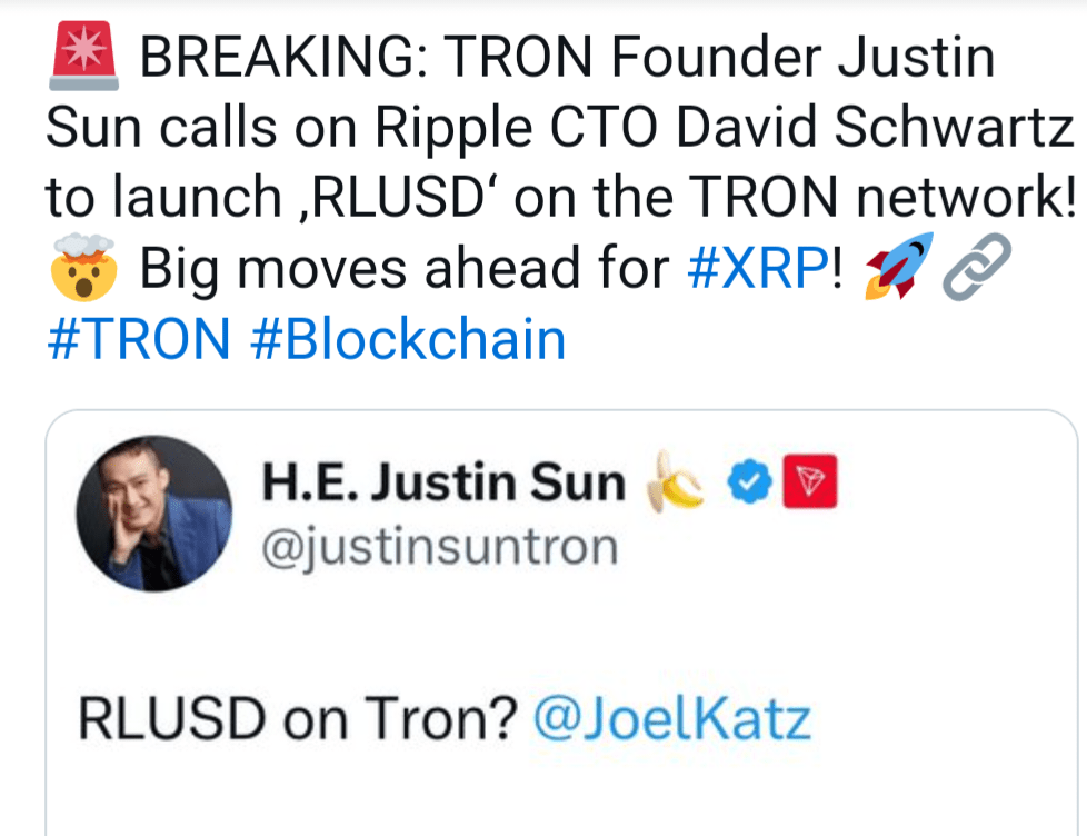 Recentemente, il fondatore della rete Tron, Justin Sun, ha pubblicato riguardo a una possibile collaborazione tra Ripple e Tron. Sun spera di lanciare RLUSD sulla rete Tron e ha aperto una discussione con il CTO di Ripple, David Schwartz. Allo stesso modo, il fondatore di Cardano, Charles Hoskinson, è stato anche in contatto con il team di Ripple.