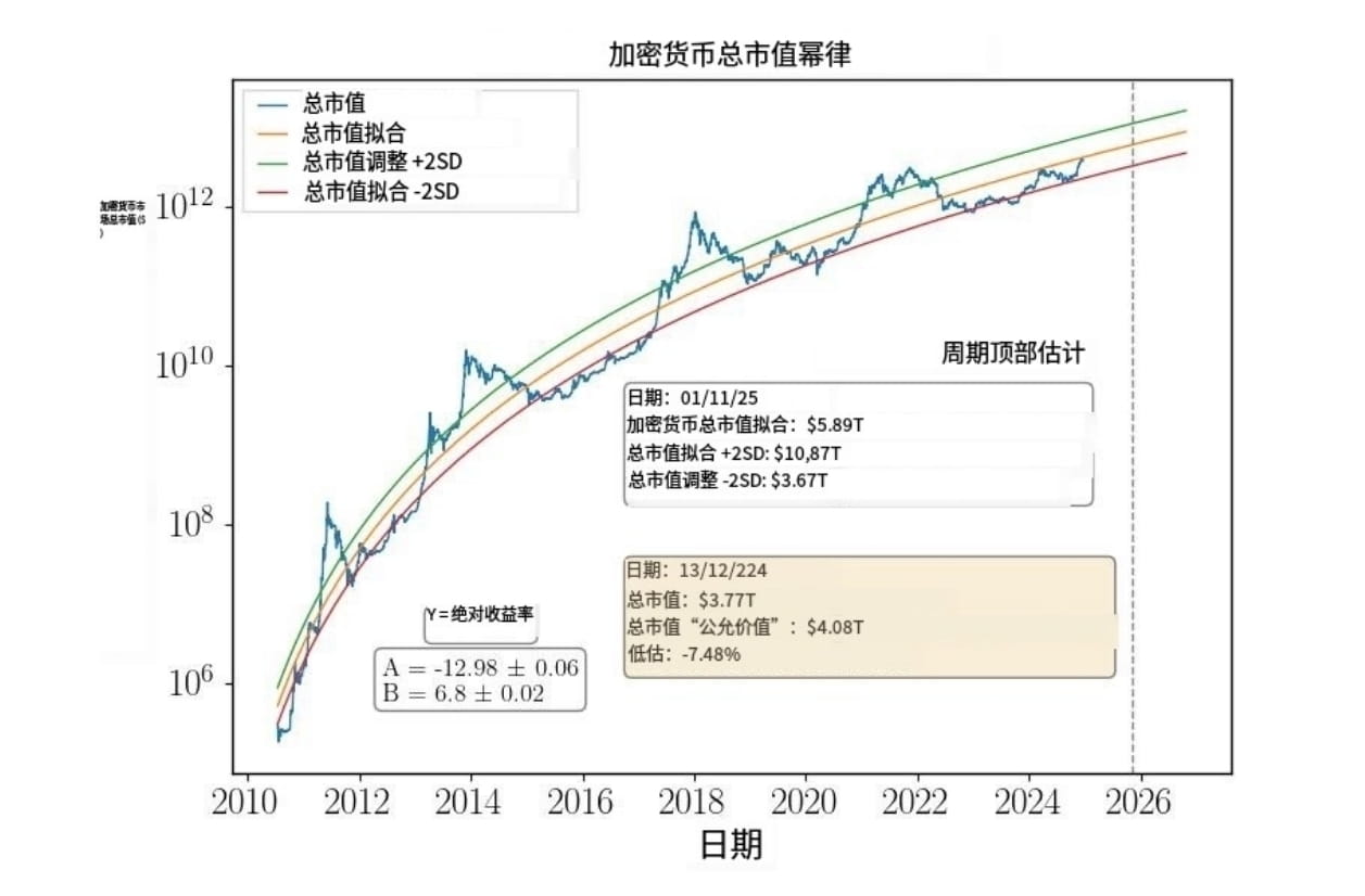 5. Attualmente la capitalizzazione totale delle criptovalute #Crypto🚀🚀 è di 3,77 trilioni di dollari, vicino al suo valore equo di 4,08 trilioni di dollari, con una stima di almeno +2SD al picco del ciclo del mercato rialzista del 2025, il valore raggiunge 10,8 trilioni di dollari (presumendo che il picco si verifichi intorno a novembre 2025), c'è ancora un enorme spazio di crescita