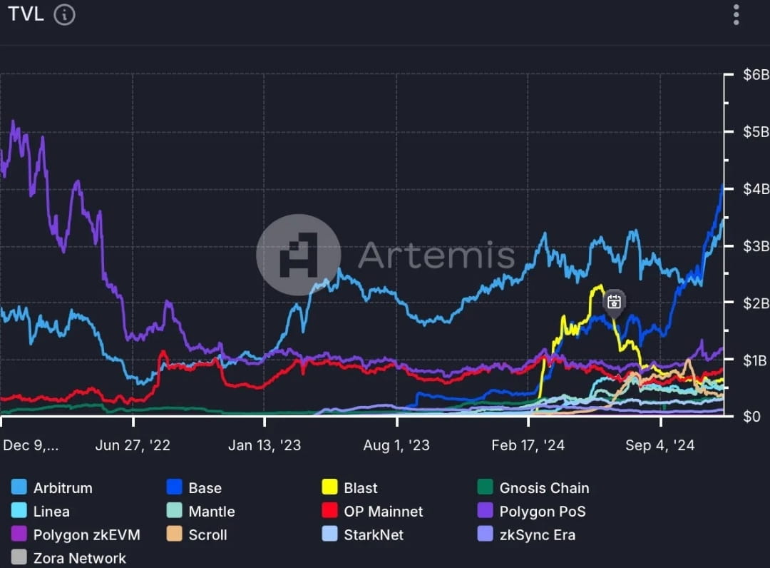 8. BASE è diventato la rete di scaling Ethereum leader, con un TVL superiore a 4 miliardi di dollari, è la prima rete a raggiungere questo livello dopo il PoS nel 2022 #Polygon , #Base ora supera #arbitrum $ARB in TVL, volume di scambi DEX, volume di scambi giornalieri e indirizzi attivi; ovviamente, domina anche l'attività delle stablecoin (Figura 4)