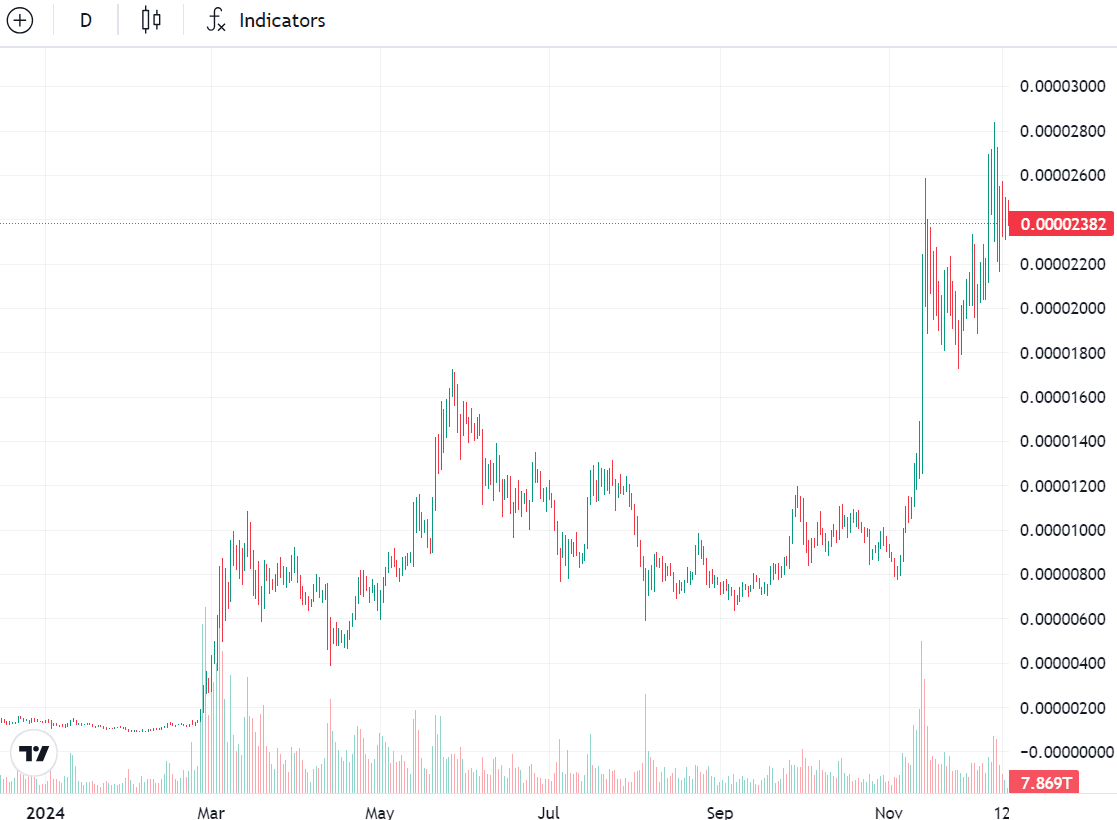 Da inizio anno, Pepe è aumentato di oltre il 1.600% come il secondo miglior performer tra le prime 100 criptovalute, seguito dal Dogwifhat basato su Solana.