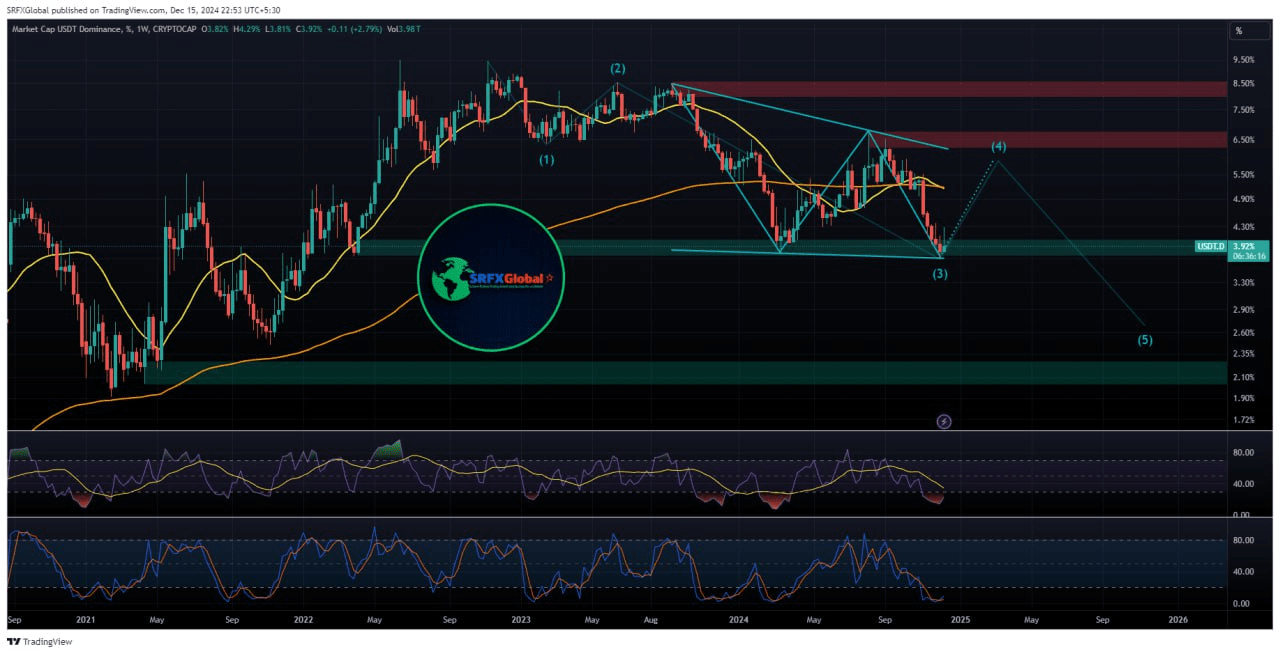 - Target di Prezzo Chiave: Osserva da vicino la dominanza di USDT per raggiungere circa il 4.2%, 5.5% e persino il 6.5%. Un rimbalzo da questi livelli di supporto potrebbe segnalare un'opportunità matura per trader esperti di esplorare investimenti in altcoin.