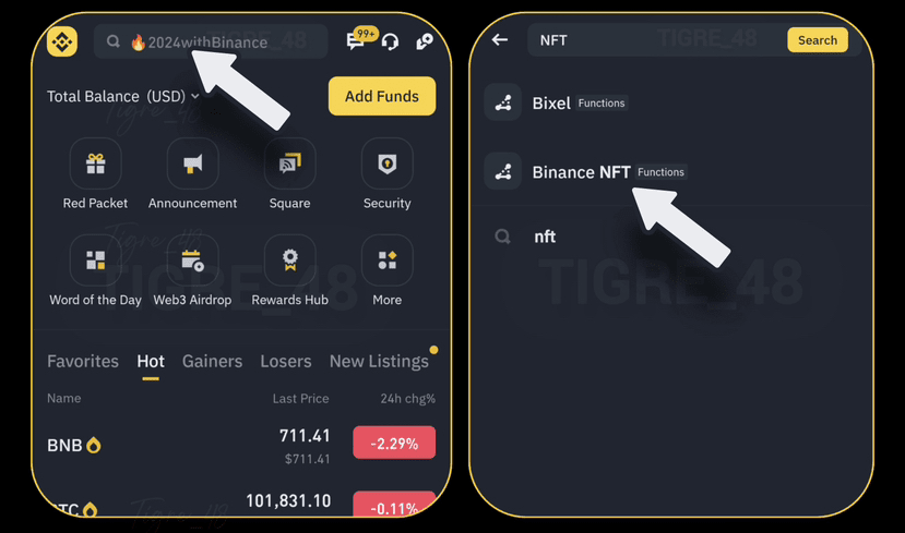 Per prima cosa, trova il motore di ricerca nel menu principale. Poi, clicca su Binance NFT. Se questa opzione non appare, è consigliabile cambiare la lingua dell'app in inglese.