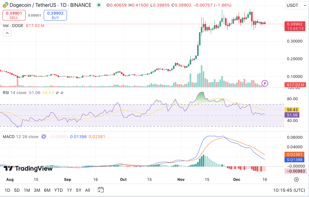 L'azione dei prezzi di Dogecoin mostra che la moneta è in una fase di consolidamento, ma ci sono alcuni livelli di prezzo importanti da tenere d'occhio. DOGE ha recentemente raggiunto un massimo di $ 0,4150, che ora rappresenta un livello di resistenza chiave.