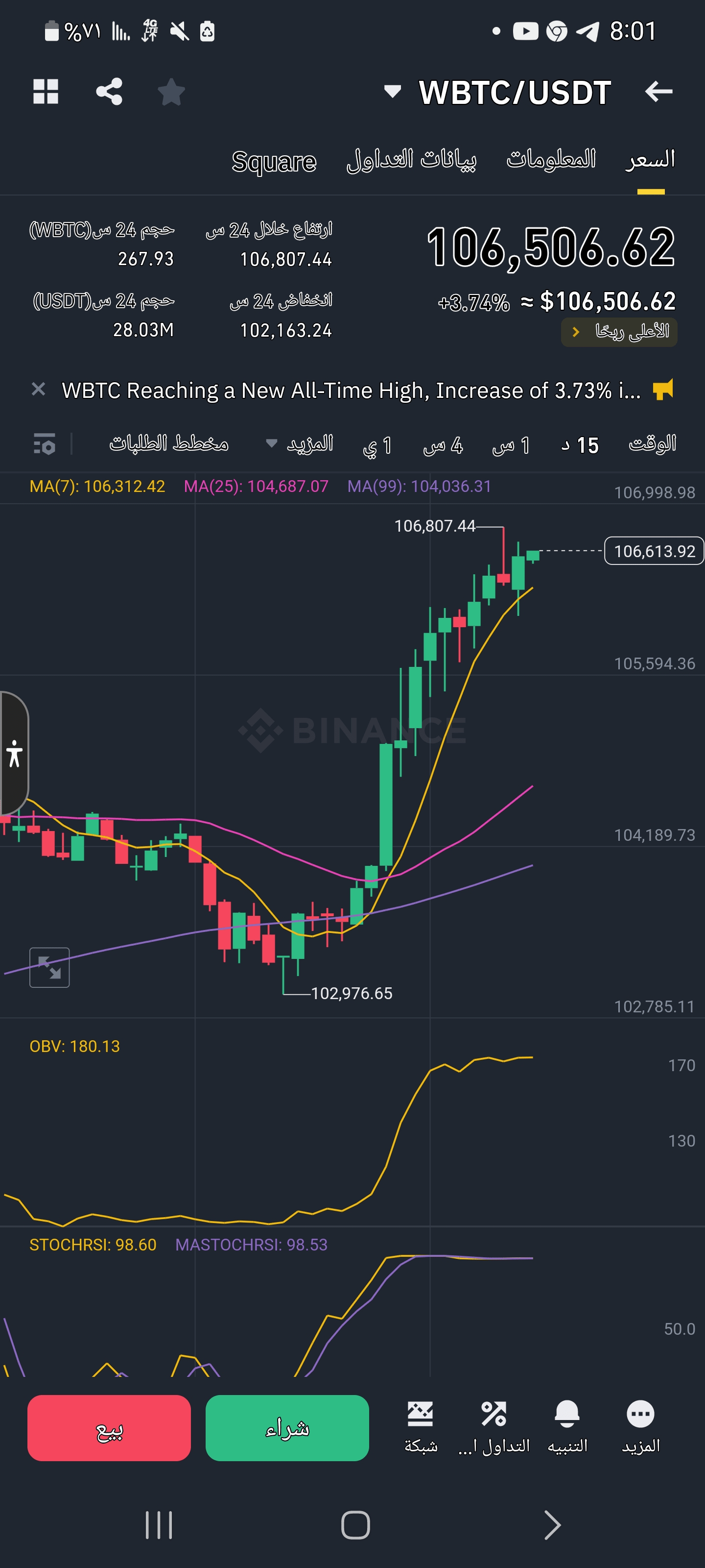 Il 16 dicembre 2024, alle 16:38 (UTC). Secondo i dati di mercato di Binance, WBTC ha raggiunto il massimo storico, scambiando a 106.708,75 USDT. Incremento nelle 24 ore del 3,73%