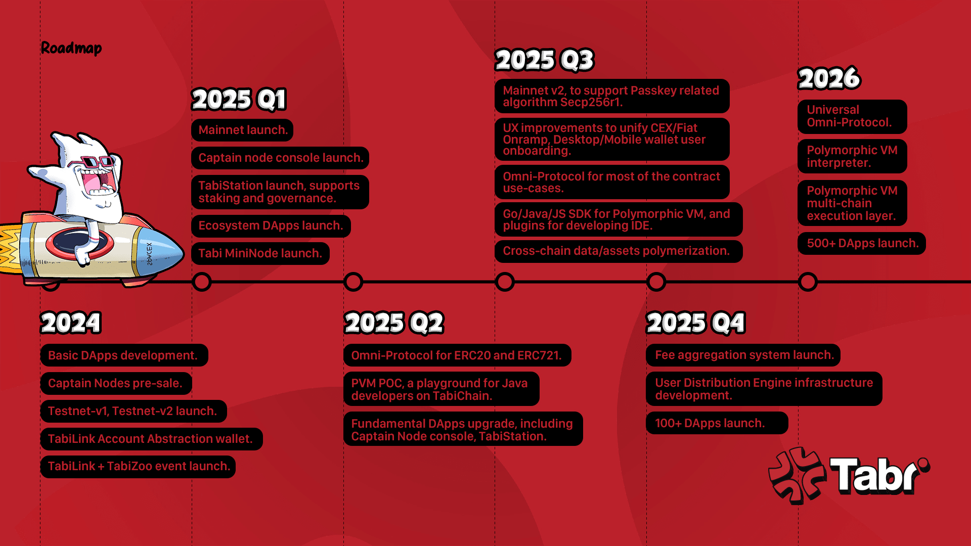 Il primo trimestre del 2025 non è solo un altro trimestre. È la rampa di lancio per il futuro di Tabi. Con Mainnet, staking, governance, MiniNodes e DApp che prendono vita, Tabi è pronta a mantenere la sua promessa di valore e innovazione.