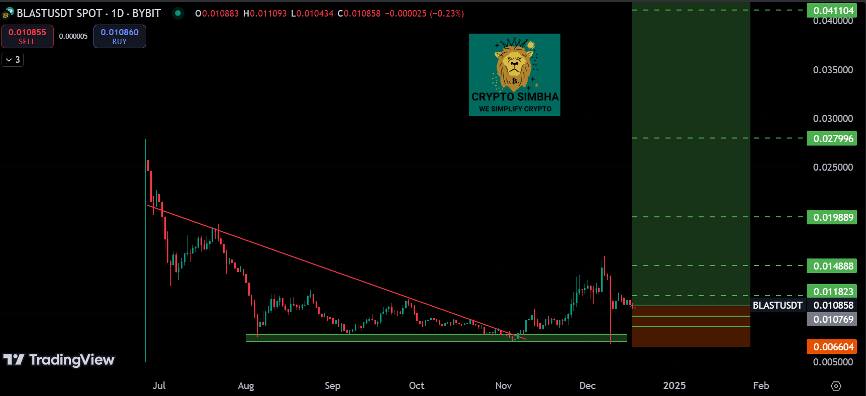 Il grafico di Blast/USDT segnala un'inversione rialzista dopo aver rotto un triangolo discendente all'inizio di novembre. Il prezzo è rimbalzato più volte dalla forte zona di supporto orizzontale intorno a $0.0071–$0.0078.