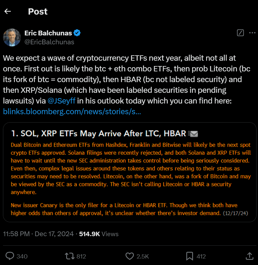 Oltre a BTC, ETH, SOL e XRP, James Seyffart crede anche che LTC e HBAR possano essere approvati prima. Il motivo è che la SEC non ha mai classificato LTC e HBAR come titoli, il che potrebbe aiutarli ad evitare di affrontare rigorosi ostacoli legali.