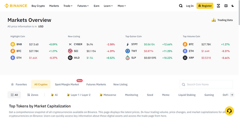 La pagina Mercati è dove trovi tutte le criptovalute disponibili per il trading su Binance, inclusi il mercato Spot e Margin, il mercato delle funzionalità, i migliori guadagni e le monete con il volume di trading più alto, e nuove quotazioni.