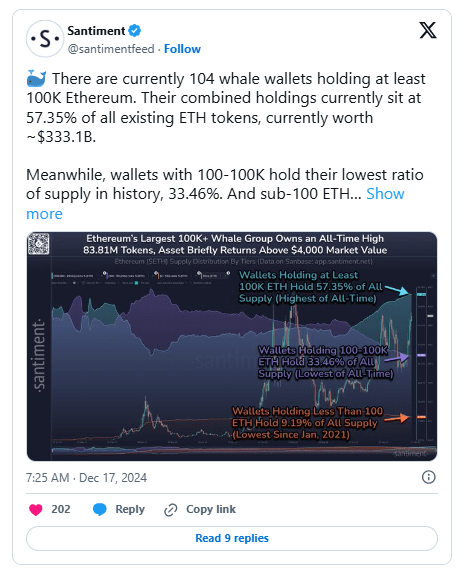 Nel frattempo, l’attività delle balene di Ethereum ha raggiunto livelli record, con solo 104 portafogli che controllano il 57,35% dell’offerta totale di ETH. Questa concentrazione della ricchezza solleva preoccupazioni sulla possibilità di manipolazione del mercato e di future fluttuazioni dei prezzi. Gli analisti avvertono che tale posizione dominante potrebbe portare a forti fluttuazioni dei prezzi, con un impatto sugli investitori al dettaglio.