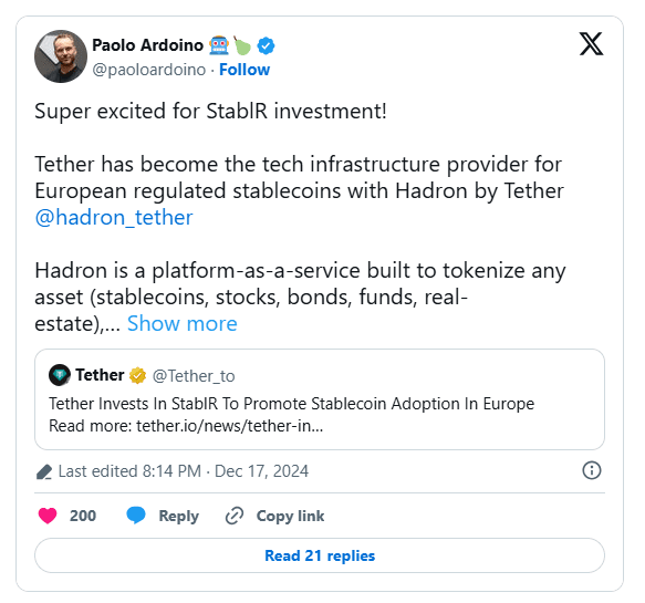 Sul fronte tecnologico, Tether ha annunciato che la sua piattaforma crittografica Hadron offrirà l'accesso completo alle API a febbraio. Questo aggiornamento è volto a semplificare l'integrazione per gli investitori istituzionali e consente l'accesso senza interruzioni alla tokenizzazione degli asset del mondo reale (RWA).