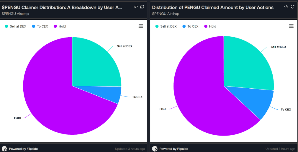Il comportamento post-airdrop mostra una chiara diversificazione: il 50% degli utenti ha scelto di tenere i propri token, il 30% ha venduto immediatamente su exchange decentralizzati (DEX) e il 20% ha trasferito i propri token su exchange centralizzati (CEX). Sebbene oltre la metà dei token reclamati non sia stata venduta, la pressione di vendita del gruppo rimanente ha comunque dominato il mercato, causando una flessione del prezzo di PENGU di oltre il 50% rispetto al suo picco.