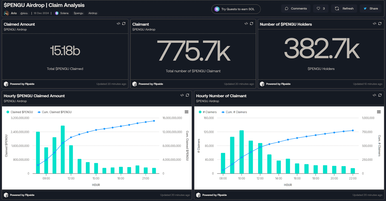 Durante il periodo di picco dalle 20:00 alle 00:00 del 17 dicembre, il volume di reclamo dei token ha visto un forte aumento, con oltre 2,4 miliardi di PENGU reclamati all'ora. Il numero di partecipanti che hanno reclamato l'airdrop ha raggiunto il picco di 160.000 in questo intervallo di tempo prima di diminuire gradualmente successivamente.