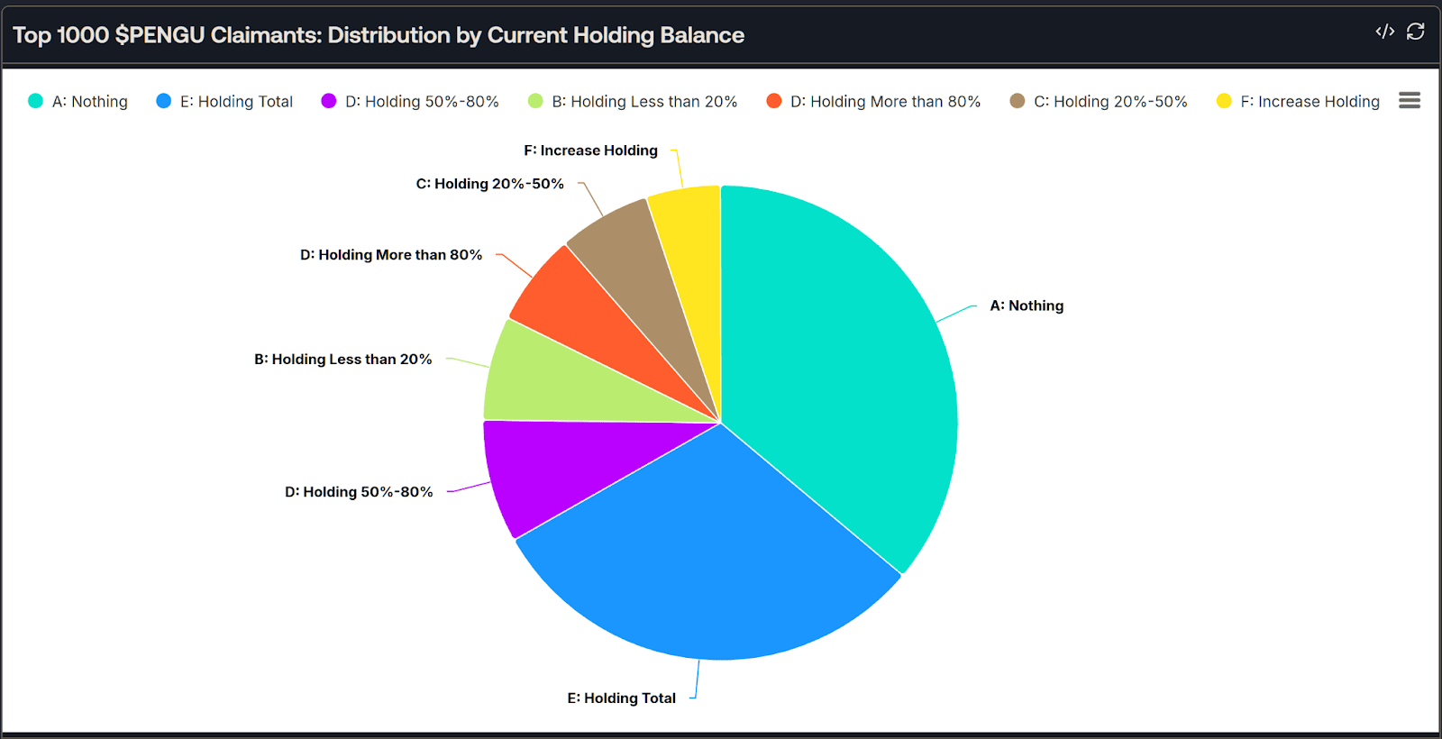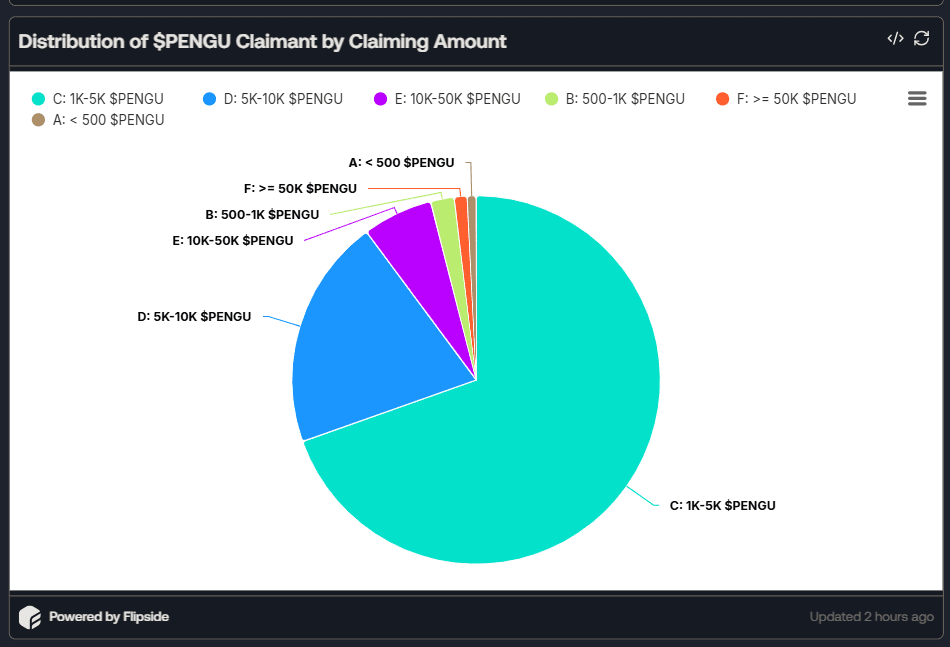 Un totale di 15,18 miliardi di PENGU, equivalente al 17,1% dell'offerta totale, è stato reclamato da circa 775.700 indirizzi di portafoglio. Tuttavia, il numero attuale di detentori è sceso a soli 382.700, indicando una significativa svendita di token poco dopo che il progetto ha abilitato le richieste di token e il trading sugli exchange.