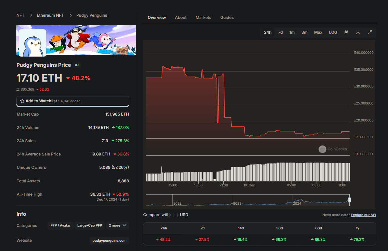 Non solo il token PENGU è stato negativamente colpito, ma anche il prezzo minimo della collezione NFT dei Pudgy Penguins ha subito un forte calo. Il prezzo minimo degli NFT è sceso da 33 ETH a 16 ETH, perdendo metà del suo valore. Di conseguenza, i Pudgy Penguins sono scesi al terzo posto nella classifica della capitalizzazione di mercato degli NFT, facendo spazio al Bored Ape Yacht Club, che mantiene un prezzo minimo di 18,89 ETH.