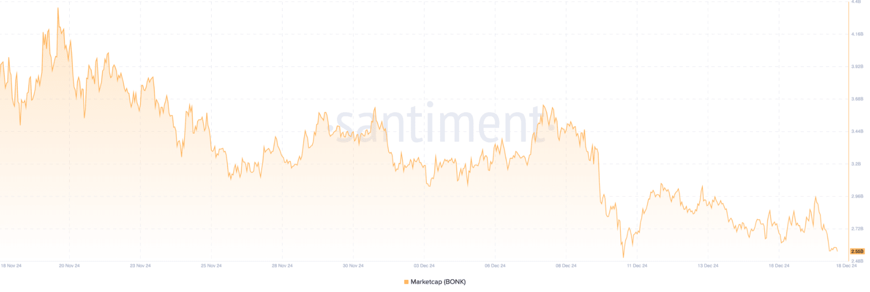 La capitalizzazione di mercato di Bonk (BONK), una moneta meme sulla piattaforma Solana, è diminuita di 2,13 miliardi di dollari negli ultimi 30 giorni. Questo calo deriva da una diminuzione del 40% del prezzo del token.