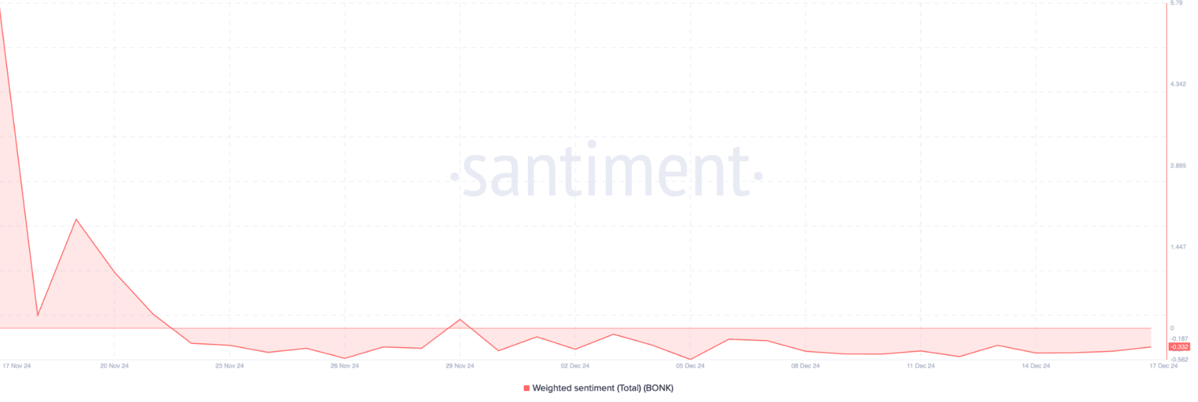 Un altro indicatore che mostra la probabilità che BONK continui a diminuire è il Weighted Sentiment, che combina il volume delle discussioni sui social media e l’atteggiamento di tali discussioni nei confronti di una criptovaluta.