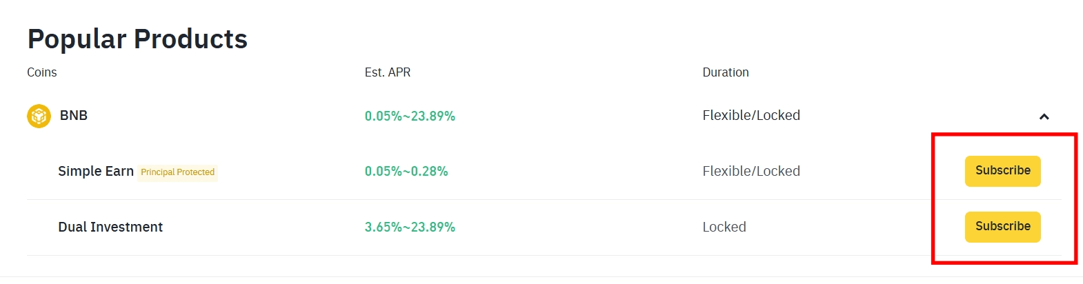 👉Fai clic su "Iscriviti" sul prodotto Simple Earn (Flessibile, Bloccato) per cui desideri registrarti.