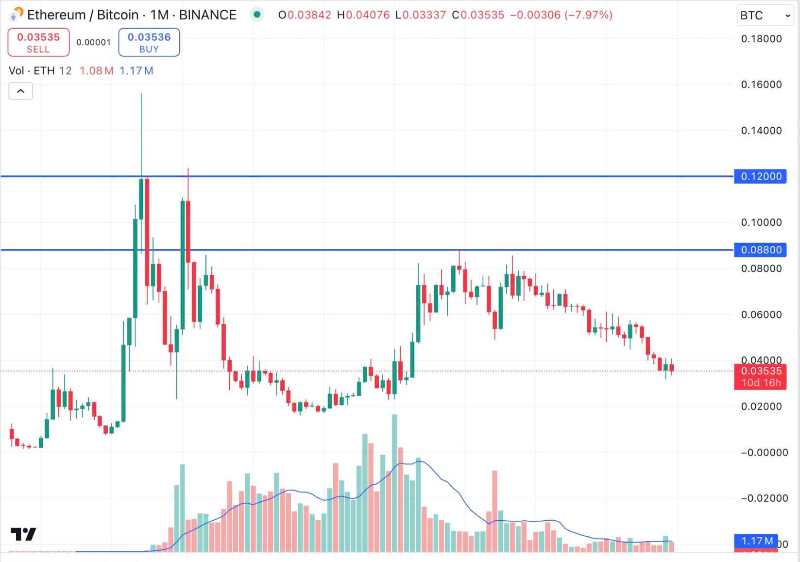 Nello scenario più estremo, se BTC raggiunge un picco di circa $180.000 e ETH/BTC arriva a 0,12 (il picco del ciclo del 2017), allora ETH sarebbe: 0,12 x $180.000 = $21.600 (6 volte il prezzo attuale).