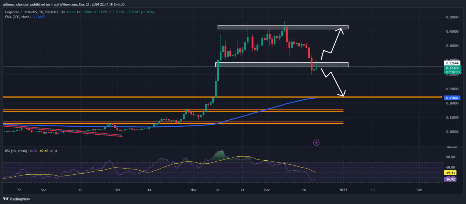 Dopo l'accumulo da parte delle balene, il prezzo di Dogecoin ha registrato un notevole aumento. Negli ultimi 48 ore, il token ha guadagnato oltre il 25%, secondo i dati di CoinMarketCap. All'ultimo aggiornamento, DOGE sta scambiando vicino a $0.32, segnando un aumento dell'8% nelle ultime 24 ore.