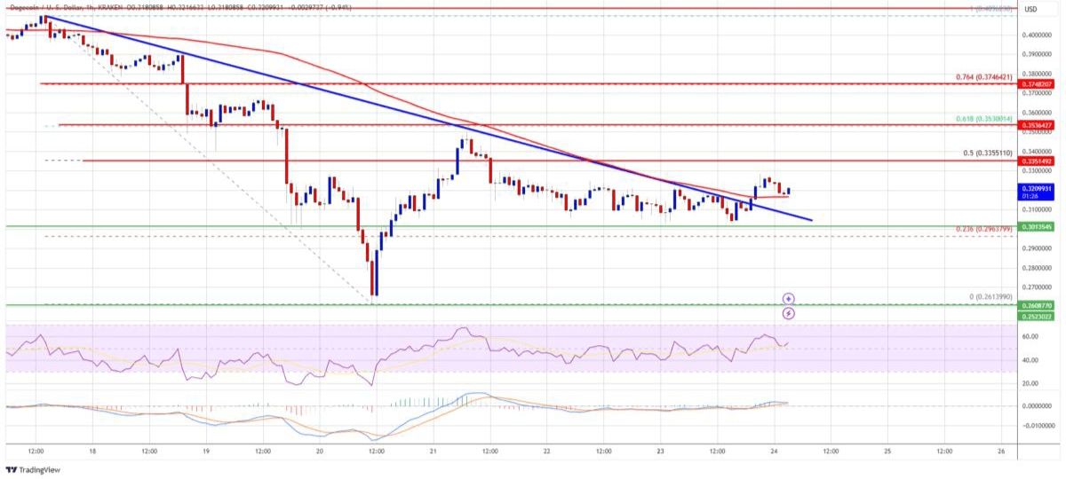 Si è verificata una rottura sopra una linea di tendenza ribassista con resistenza vicino a $0.3120 sul grafico orario DOGE/USD.
