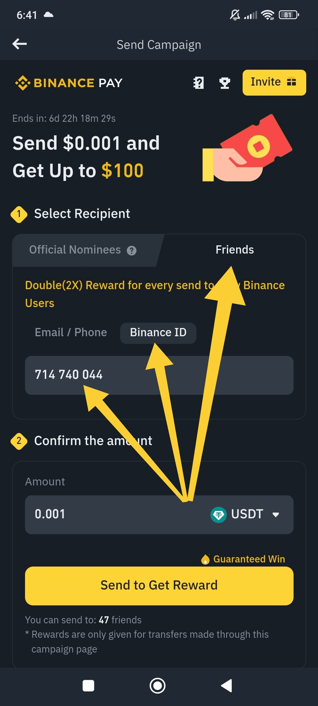 1- Puoi inviare un minimo di $0.001 una volta al tuo amico.