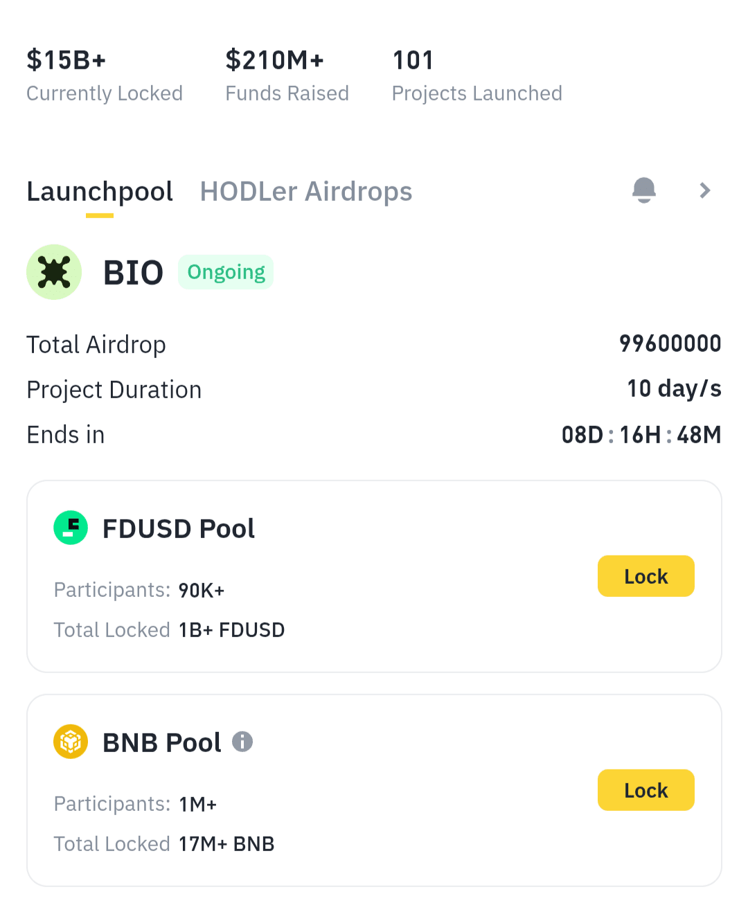 Se possiedi $BNB o FDUSD, puoi mettere in stake questi asset per guadagnare token BIO su Binance Launchpool. Questo ti consente di ottenere token BIO senza costi aggiuntivi.