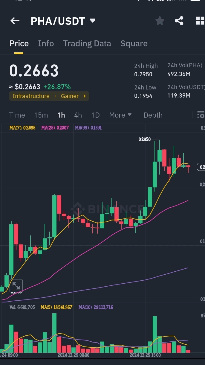Basato sull'azione dei prezzi e sugli indicatori, sembra che la coppia PHA/USDT sia attualmente in un forte trend rialzista con un guadagno significativo nelle ultime 24 ore (26.87%). Tuttavia, con un massimo di 0.2950 e un minimo di 0.1954, c'è una volatilità notevole.