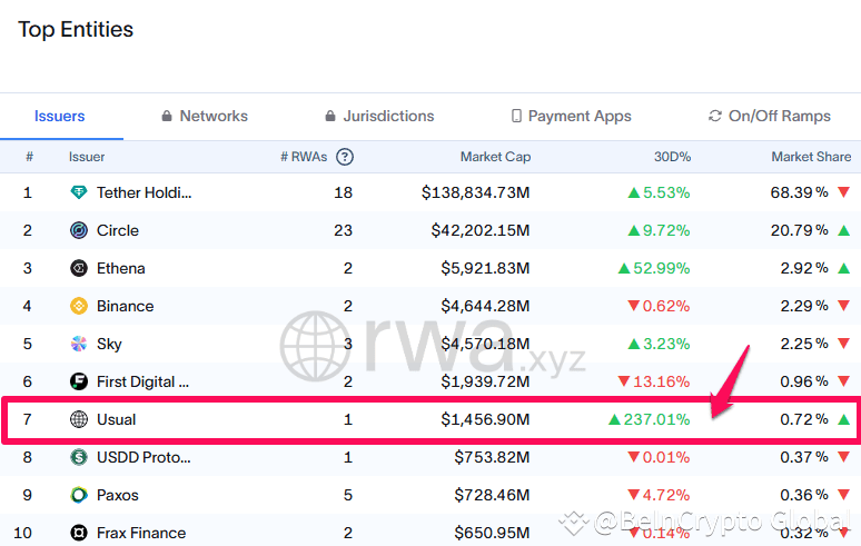 I dati di RWA.xyz indicano che la capitalizzazione di mercato di USD0, la principale stablecoin di Usual, è cresciuta da 20 milioni di dollari a metà del 2024 a oltre 1,4 miliardi di dollari. Negli ultimi 30 giorni, la capitalizzazione di mercato di USD0 è aumentata del 237%, rendendola la stablecoin in più rapida crescita del mese.
