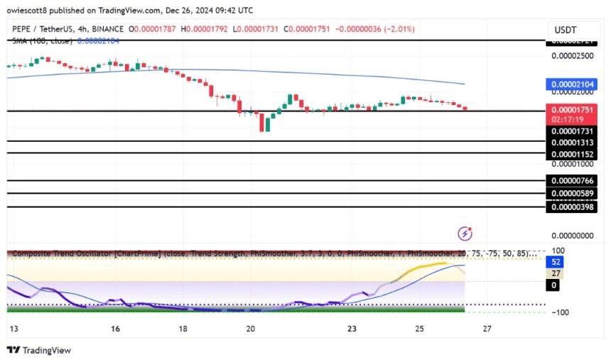 Il momentum rialzista di PEPE ha subito un colpo, con il prezzo che è tornato a un livello di supporto cruciale a $0.00001748. Questo arretramento mette sotto pressione i rialzisti per mantenere la linea mentre le forze ribassiste riconquistano forza.