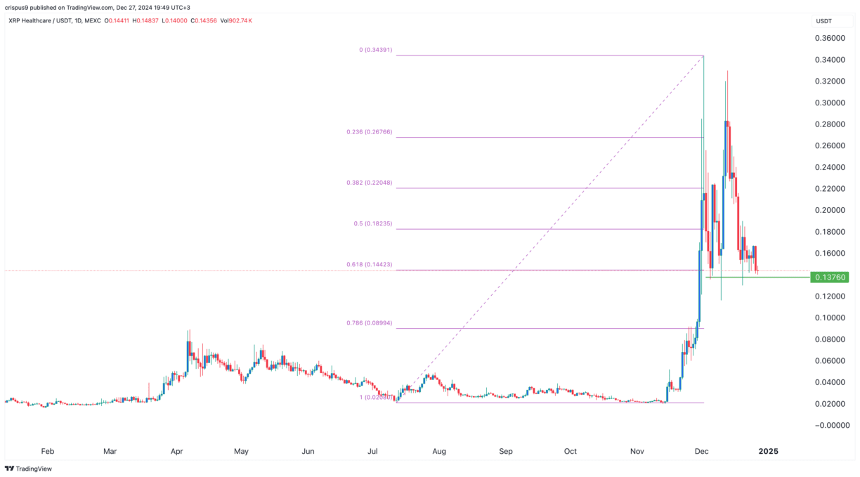 Il token XRPH veniva scambiato a $0.1435, in calo rispetto al massimo dell'anno di $0.3440. Questo ritiro è avvenuto a causa del continuo ritiro del prezzo di XRP. Pertanto, poiché fa parte del suo ecosistema, c'è la possibilità che rimbalzi quando Ripple recupera prima e dopo l'approvazione dell'ETF.
