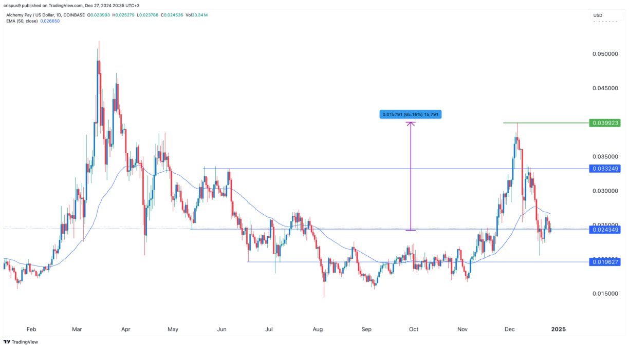 Il prezzo di Alchemy Pay è sceso sotto la media mobile a 50 giorni e ha formato un piccolo modello di pennant ribassista. Questo è un segnale che ha ancora spazio per scendere nel breve termine. Tuttavia, il prezzo di ACH probabilmente rimbalzerà nel 2025 e testerà nuovamente il massimo dell'anno di $0.40, che è il 65% sopra il livello attuale.