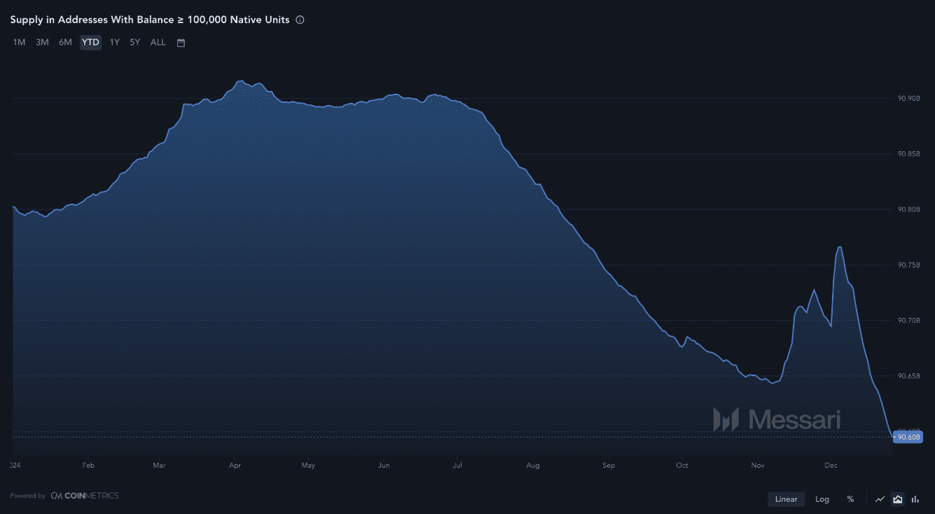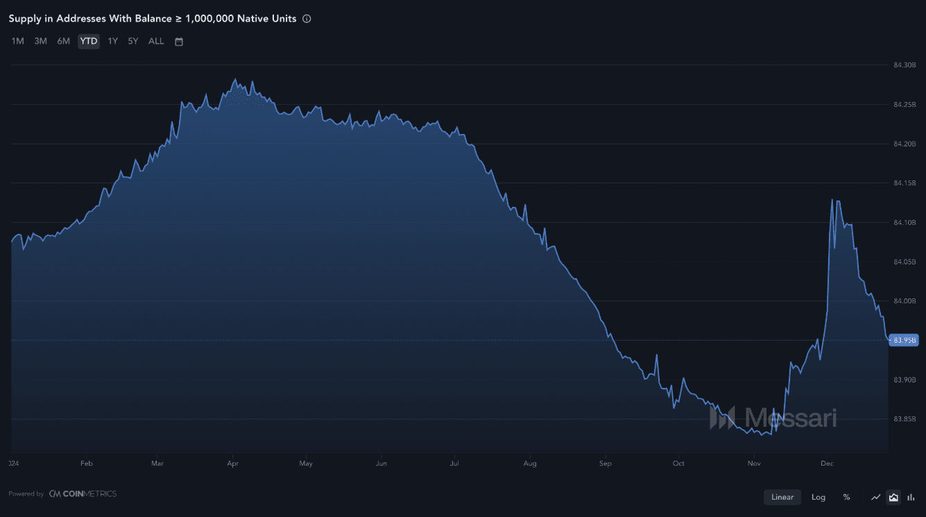 In particolare, l’offerta di XRP detenuta dagli investitori più ricchi – quelli con saldi superiori a 1 milione di token – è diminuita di 180 milioni dall’inizio di dicembre.