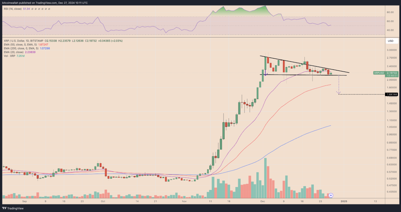 Il recente calo di XRP avviene quando il suo prezzo viene scambiato all'interno di un triangolo discendente, una struttura ribassista che spesso segnala un ulteriore calo.