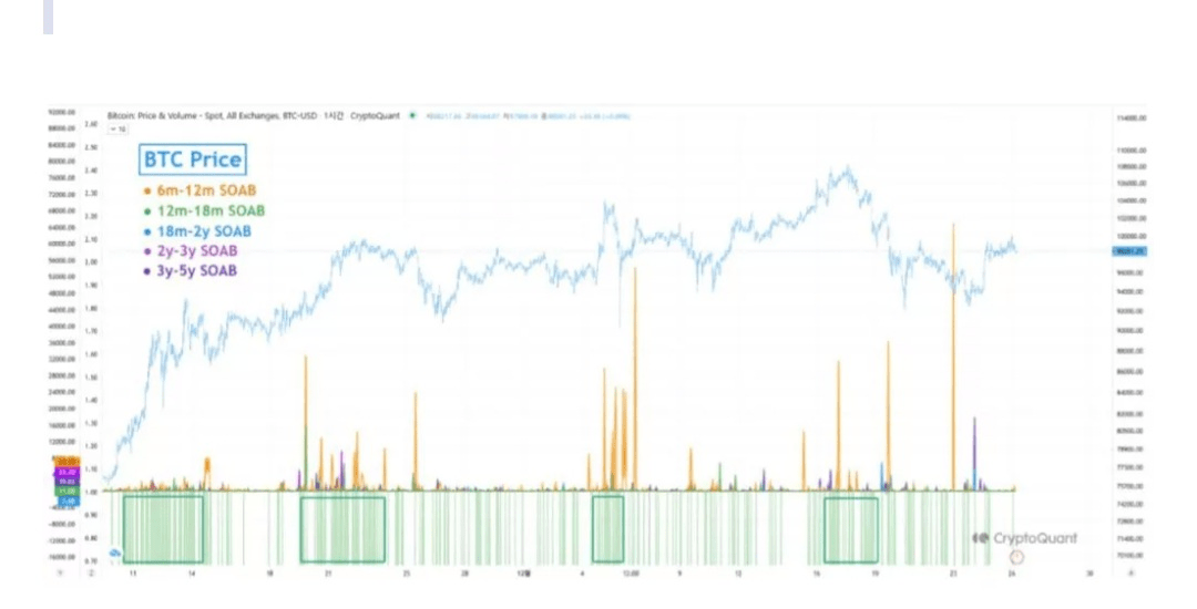 L'indicatore Spent Output Age Bands (SOAB) fornisce informazioni sulle vendite della prima criptovaluta da parte degli investitori fornendo una ripartizione per periodo di detenzione.