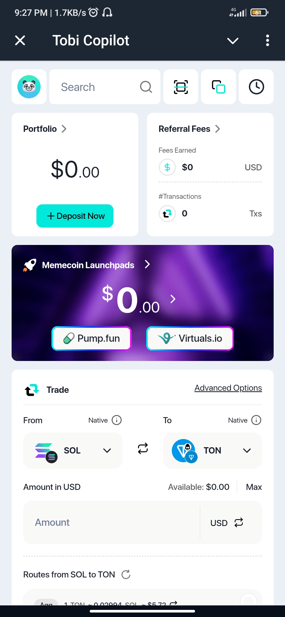 🔹 Deposita e trasferisci fondi, incluso dal tuo Wallet su Telegram