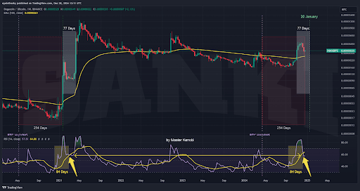 Master Kenobi ha accennato all'inaugurazione di Donald Trump il 20 gennaio 2025, come potenziale catalizzatore per il pump del prezzo di DOGE. Inoltre, il Dipartimento di Efficienza Governativa di Elon Musk (D.O.G.E) potrebbe amplificare l'inerzia di Dogecoin.