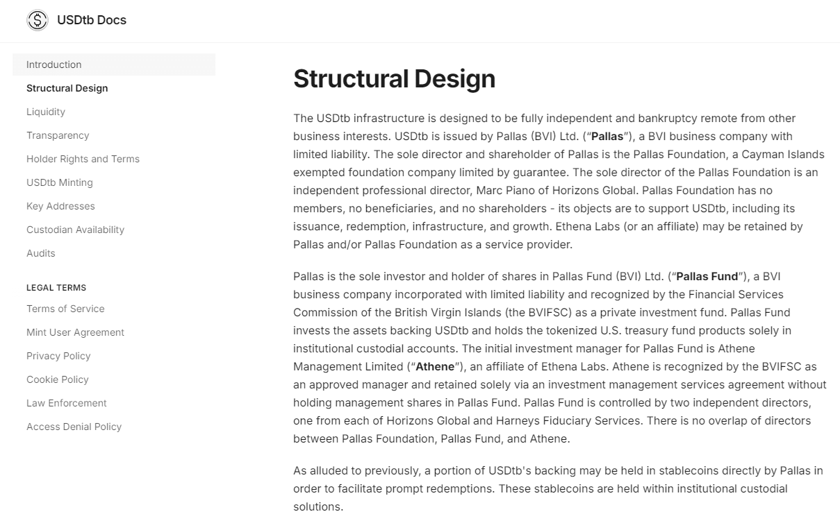 Anche se i documenti promozionali esterni e i media affermano che Ethena è l'emittente di USDtb, leggendo attentamente i documenti di USDtb possiamo scoprire che l'emittente effettivo di USDtb è una società chiamata Pallas (BVI) Ltd., il cui unico direttore e azionista è la Fondazione Pallas, e la Fondazione Pallas gestisce l'emissione e il rimborso di USDtb.