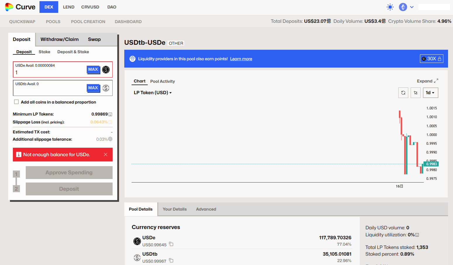 Secondo il documento di annuncio e le informazioni sul sito web di Ethena, attualmente USDtb è integrato solo in due pool LP di Curve per consentire la partecipazione degli utenti: USDtb/USDC e USDtb/USDe, di cui solo USDtb/USDe offre 30x punti airdrop di Ethena.