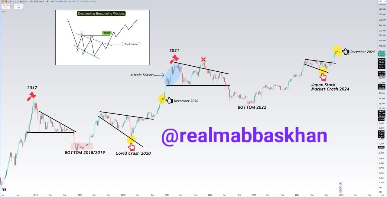 3️⃣ Conferma del cuneo allargato: la rottura a cui ci stiamo avvicinando potrebbe segnare l'inizio della prossima fase parabolica.