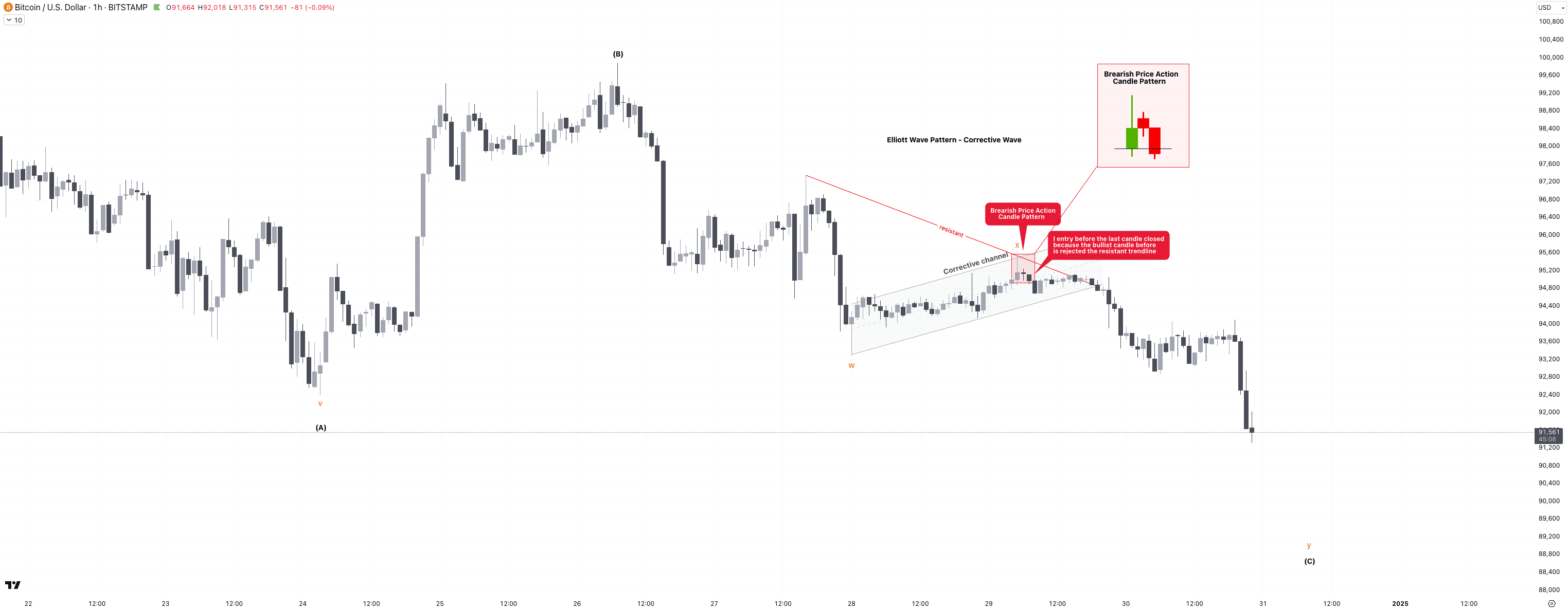 Per l'onda correttiva, in questo intervallo di tempo, all'interno dell'onda (C), ho visto il canale correttivo (grigio), quindi quando questo canale raggiunge la linea di tendenza resistente, mi concentro sulla Candela di Azione del Prezzo e aspetto che il pattern si completi per confermare questo trade short.